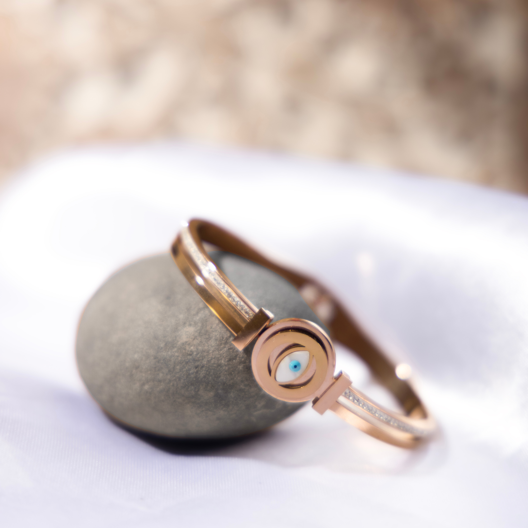 Protect your aura and enhance your style with our Evil Eye Charm Bracelet. Featuring a beautifully crafted central evil eye motif framed in a polished gold-tone setting, this piece is accented with delicate sparkling stones along the band for a touch of elegance. Symbolizing protection and good luck, it’s a must-have accessory for both everyday wear and special occasions.