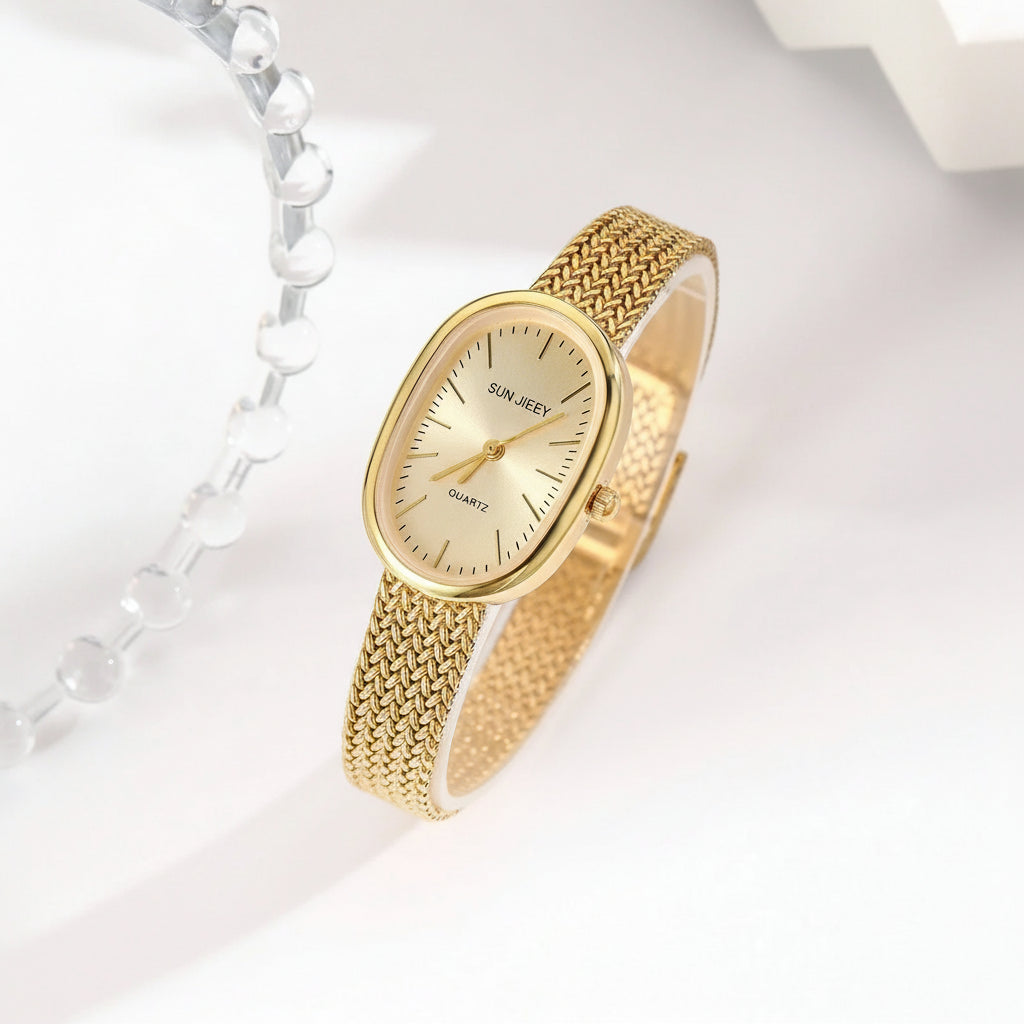 Enhance your everyday style with this Elegant Gold Mesh Strap Analog Watch for Women. Designed with a sleek oval-shaped dial and a premium gold-tone mesh strap, this watch adds a touch of sophistication and minimal elegance to any outfit.