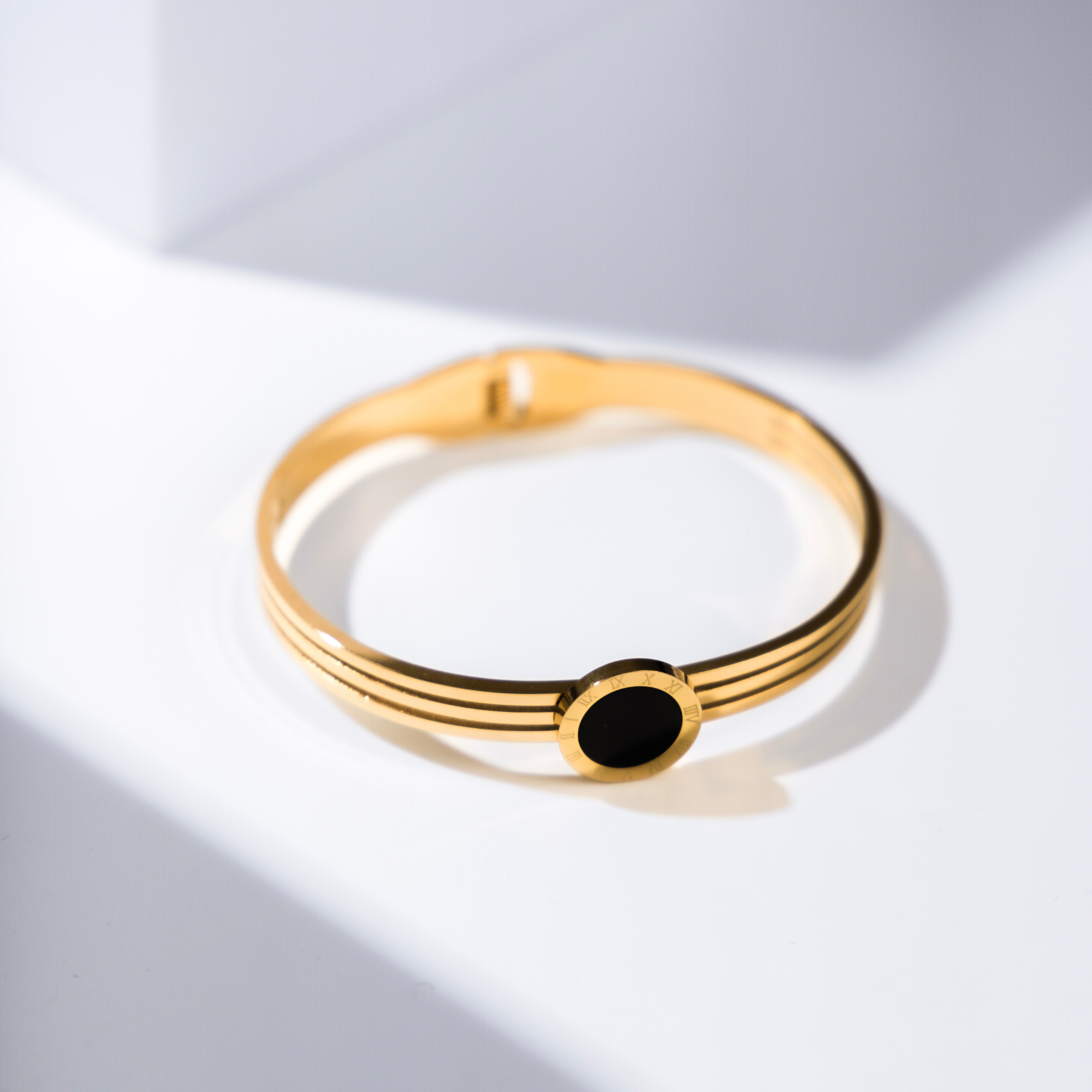 Make a timeless statement with this sophisticated gold-tone bracelet, featuring a sleek triple-band design and a striking black stone centerpiece encircled by Roman numeral detailing. The polished finish adds a luxurious touch, making this piece perfect for adding elegance and edge to any outfit — whether casual or formal.
