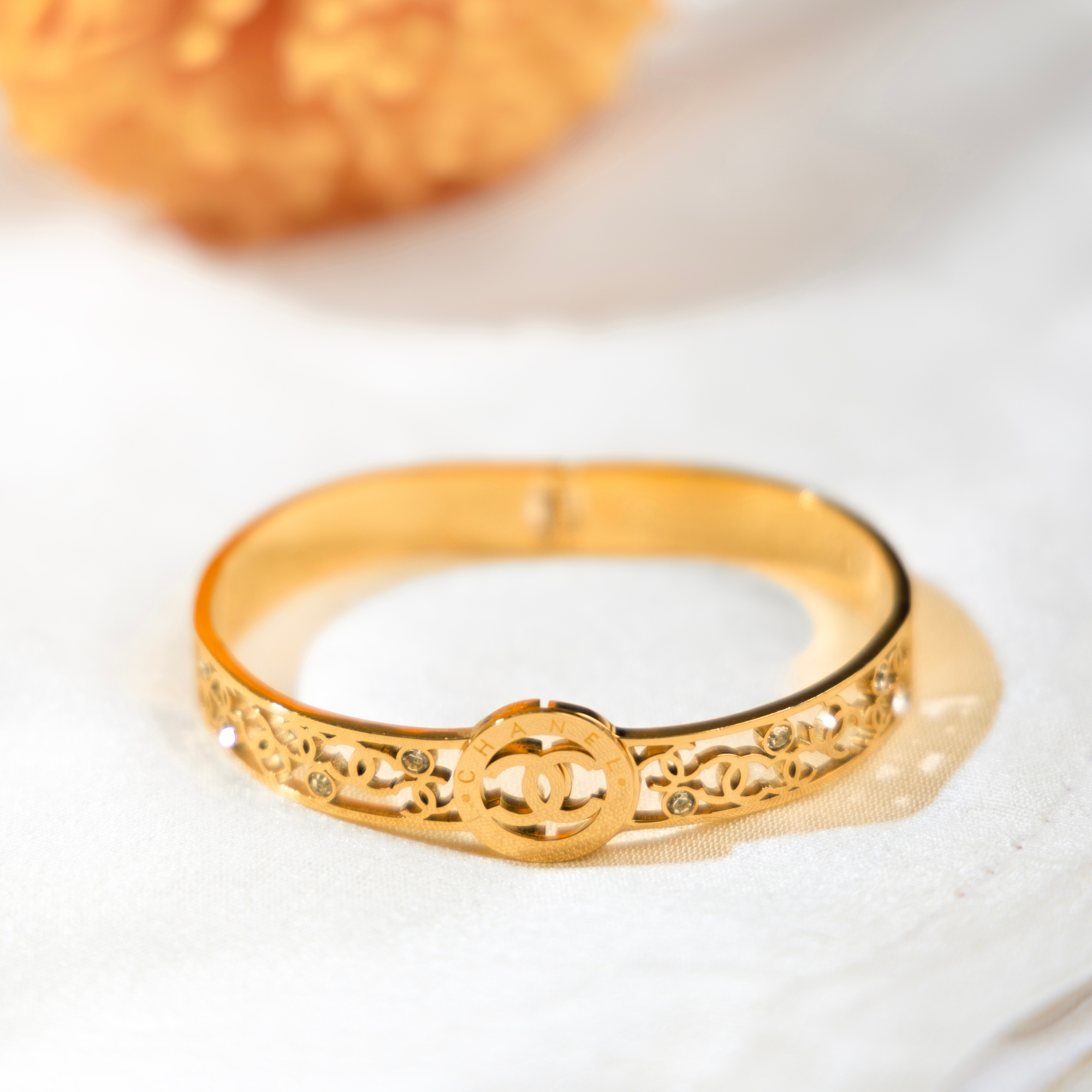 Elevate your style with this elegant designer-inspired bracelet, featuring intricate gold-toned filigree work adorned with sparkling crystal accents. The centerpiece proudly displays a sophisticated logo design, making it a perfect blend of luxury and modern fashion. Crafted with precision, this bracelet is lightweight, durable, and designed to complement any outfit, from casual chic to evening glamour. Ideal for fashion lovers who appreciate timeless elegance and statement accessories.