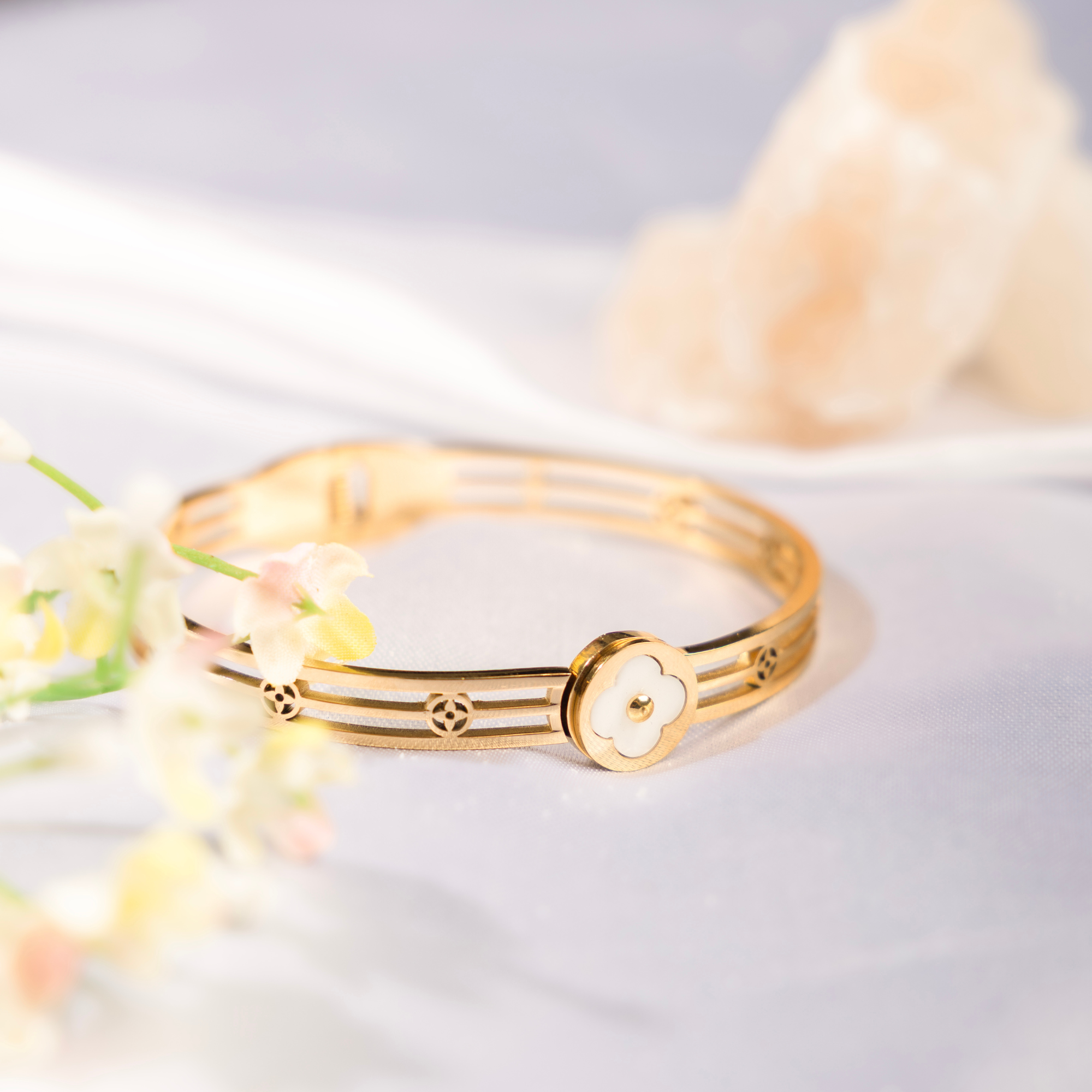 Embrace elegance and good fortune with our Classic Clover Charm Gold Bracelet. Featuring a radiant mother-of-pearl clover centerpiece framed in a golden setting, this bracelet combines timeless design with a touch of modern sophistication. The triple-band design with delicate cut-out details adds an extra layer of luxury, making it perfect for both casual and formal looks.