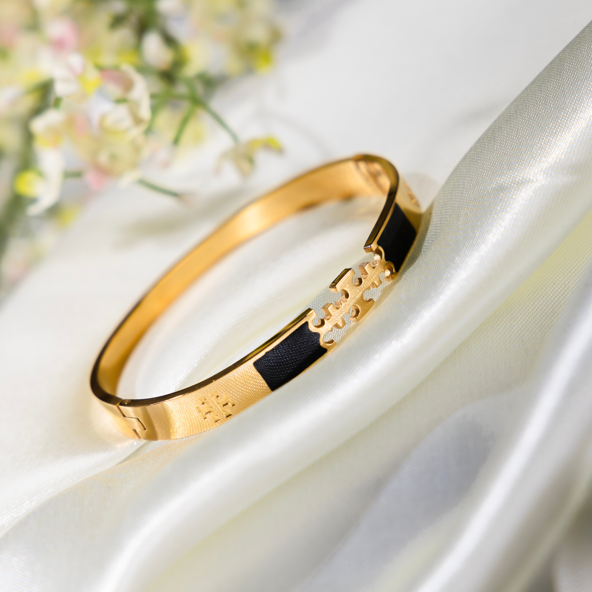 Elevate your accessory game with this modern gold-tone bracelet featuring a unique puzzle-piece style link at the center. Designed with sleek black enamel accents and a polished finish, this bracelet combines creativity with sophistication, making it a standout piece for both casual and formal outfits. Perfect for fashion enthusiasts who appreciate bold, artistic designs.