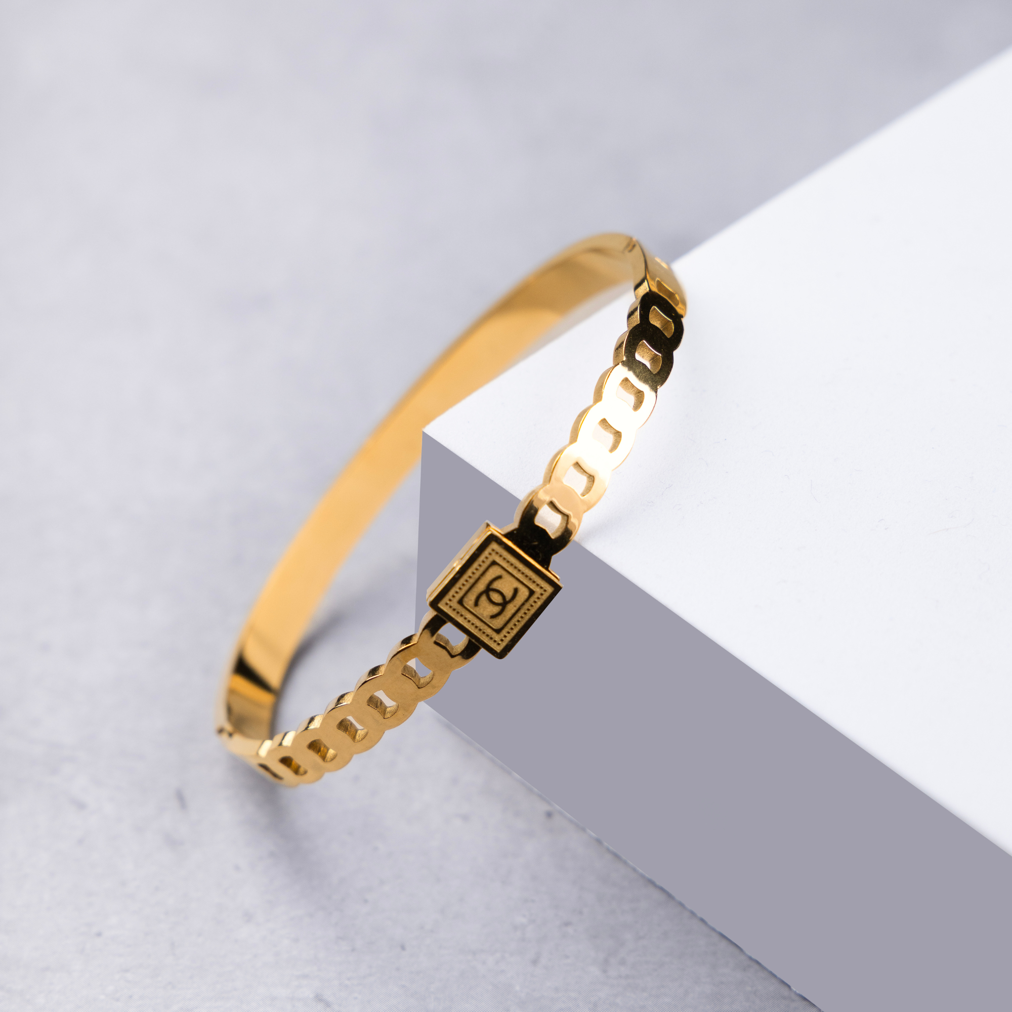 Add a touch of refined luxury to your look with this beautifully crafted designer-inspired bracelet. Featuring a unique interlocking chain design in a high-shine gold finish, it is elegantly centered with a square logo-engraved plate. Minimalistic yet eye-catching, this bracelet is perfect for everyday sophistication or elevating special occasion outfits.